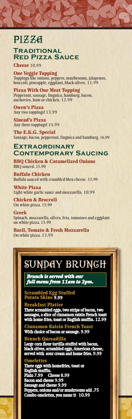 Owen’s Cobb Salad: Strips of chicken, hard-boiled egg, warmed bacon strips, crumbled bleu cheese and avocado, choice of dressing. 17.99 GF